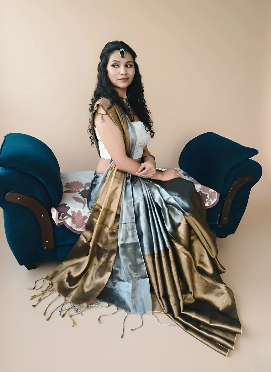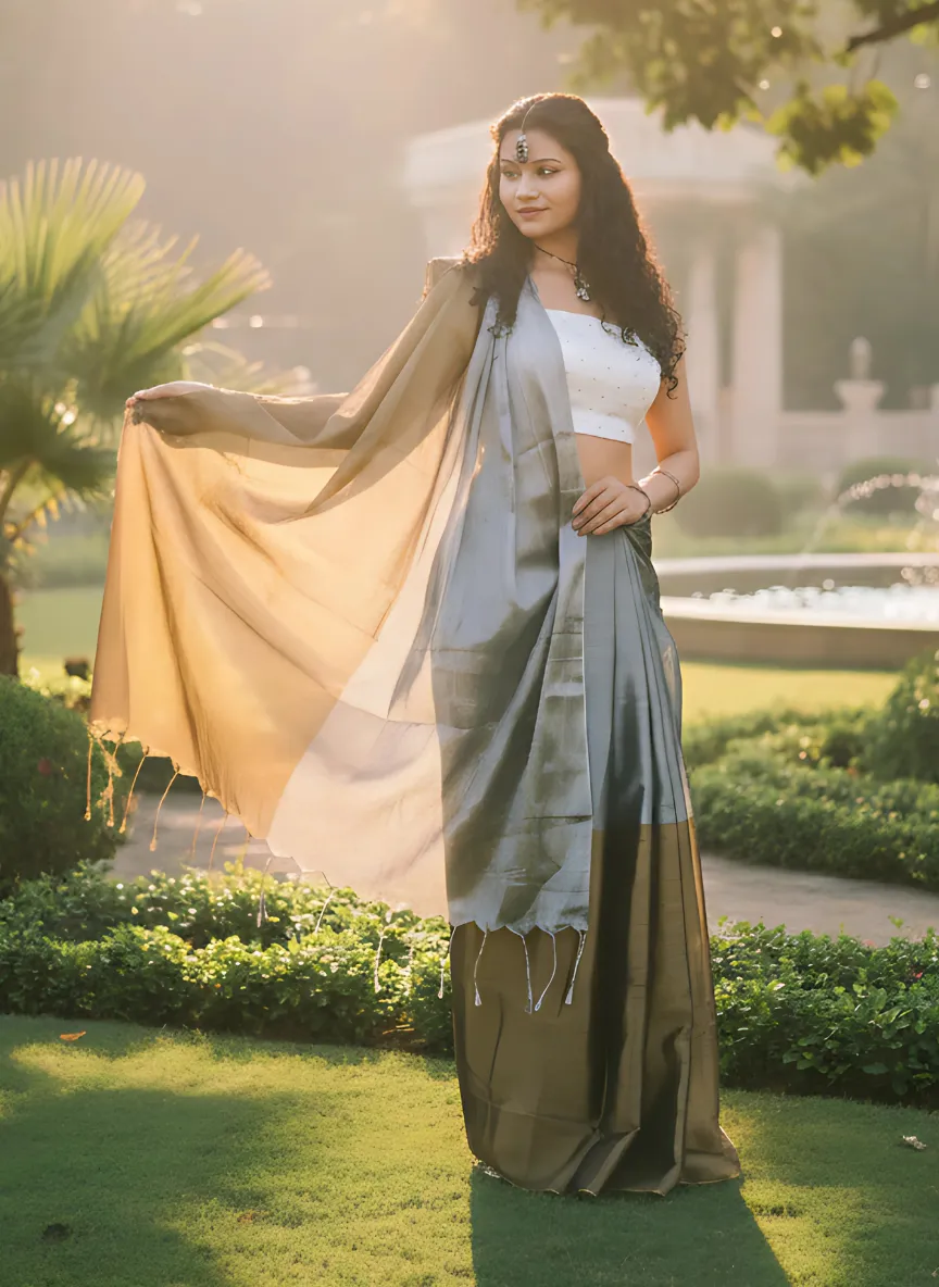 Ideal for festive mornings, formal events, or elegant daywear, the cotton tissue fabric gives a graceful fall and a soft glow — perfect for those who love minimalism with a hint of glam. Whether paired with a classic blouse or styled with modern accessories, it promises timeless charm with every drape.