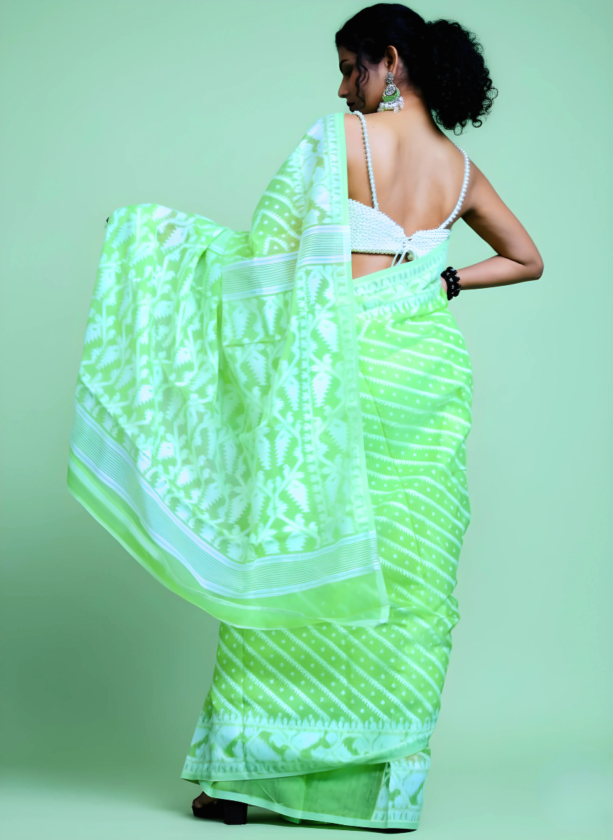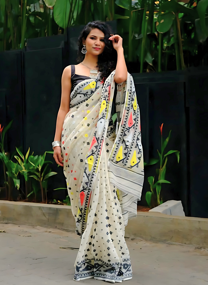 Elevate your wardrobe with the timeless elegance of our handwoven Jamdani, a true testament to the artistry of skilled weavers from Bengal. Crafted painstakingly on traditional looms, each piece tells a story—of heritage, patience, and unparalleled craftsmanship.